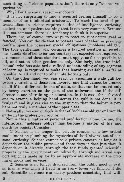 Cada cientista é, naturalmente, parte da gente comum. Paga seus impostos, será o objeto da destruição ou salvação tecnológica, e poderá sofrer da possibilidade de um desastre tecnológico pela falta de profissionais qualificados. A popularização da Ciência é, por consequência, tão necessária para o cientista quanto para qualquer outra pessoa, e se qualquer cientista encarar a popularização da ciência como vulgarização, então ele ou ela é um idiota. ⏤ Um idiota perigoso, ainda por cima.