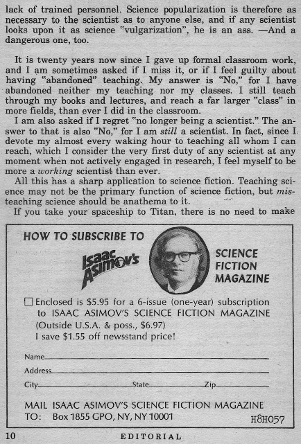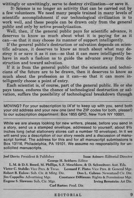 Nona edição da revista Isaac Asimov’s Science Fiction Magazine. Segue a tradução para o Português do Editorial de Isaac Asimov.