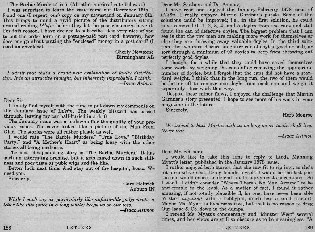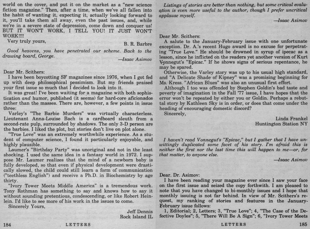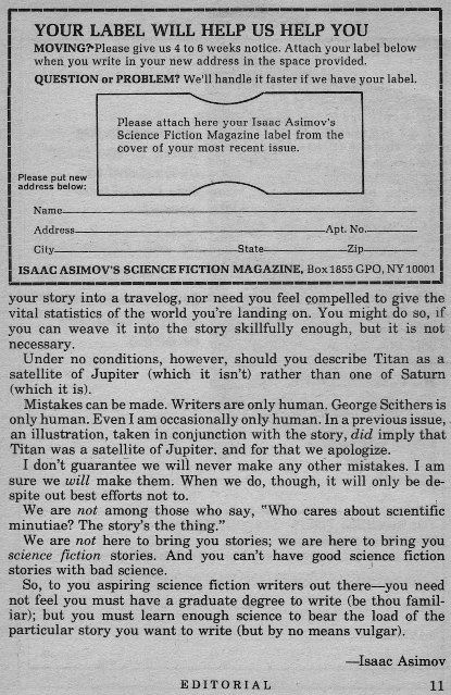 Erros acontecem. Escritores são humanos. George Scithers é humano. Até mesmo eu sou humano, de vez em quando. Em uma edição anterior, uma ilustração, observada em conjunto com a história, implicava em que Titan fosse um satélite de Jupiter, e por conta disso nós pedimos desculpas.